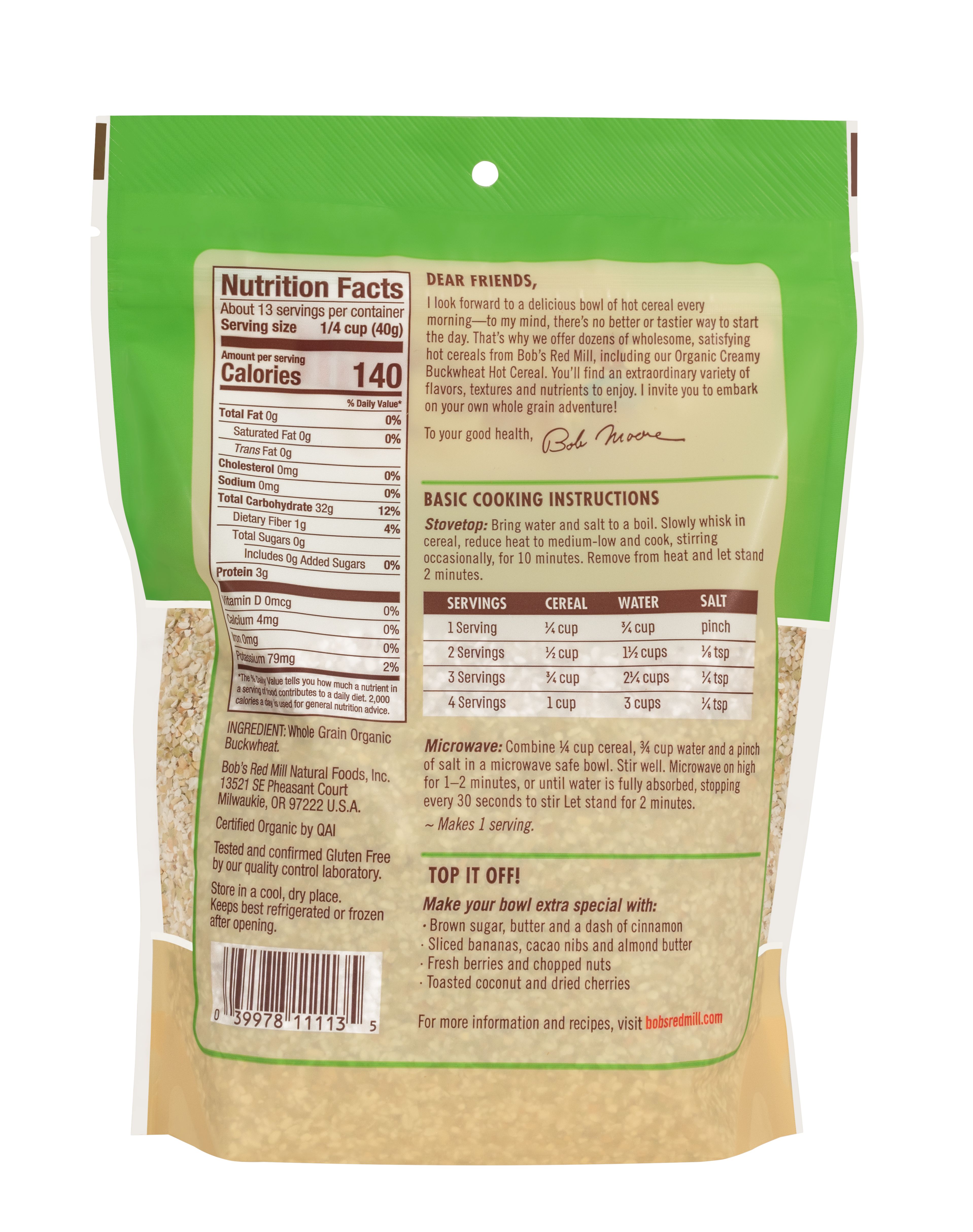 Gluten Free Organic Creamy Buckwheat Hot Cereal - back